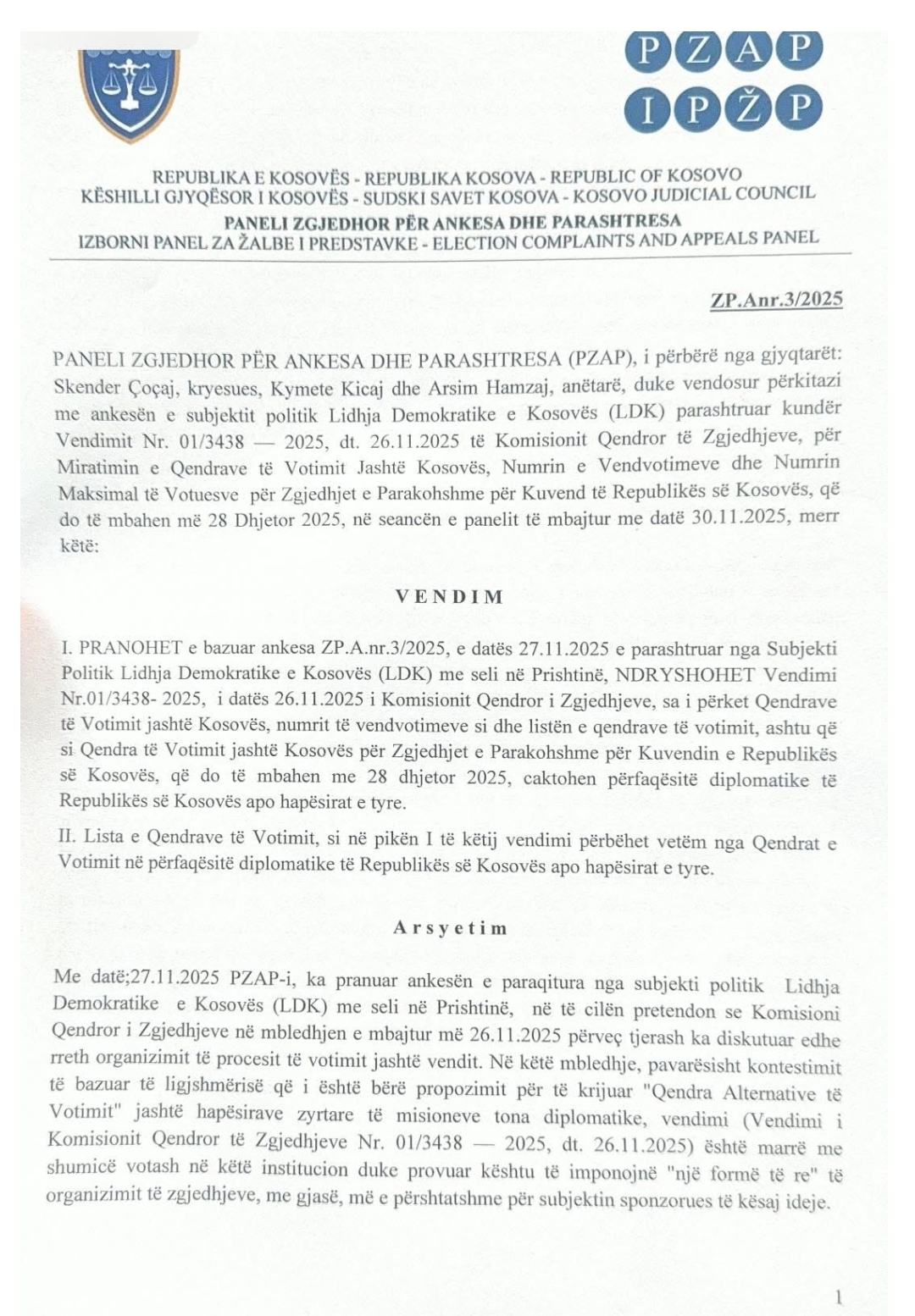 Paneli Zgjedhor për Ankesa dhe Parashtresa (PZAP) ka miratuar ankesën e Lidhjes Demokratike të Kosovës (LDK) kundër vendimit të Komisionit Qendror të Zgjedhjeve (KQZ), që lidhej me organizimin e qendrave të votimit jashtë vendit për zgjedhjet e parakohshme parlamentare të 28 dhjetorit 2025.