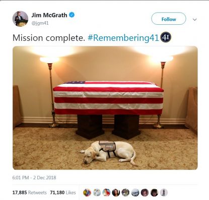 Jim McGrath, ish-zëdhënësi i George H.W. Bush, ka publikuar një imazh të qenit, Sully pranë arkivolit të Bush të dielën me përshkrimin: “Misioni përfundoi”.