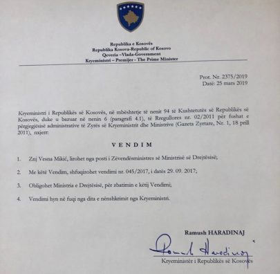 Kryeministri i Kosovës, Ramush Haradinaj, njoftoi të hënën se ka liruar nga detyra zëvendësministren e Drejtësisë, Mikiq, e cila vjen nga radhët e subjektit politik Lista Serbe.