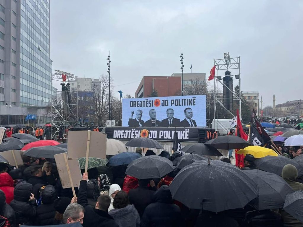 Ngjarjes i shoqëron mbishkrimi “Drejtësi, jo politikë”, së bashku me fotografitë e Hashim Thaçit, Kadri Veselit, Jakup Krasniqit dhe Rexhep Selimit, të cilët prej më shumë se pesë vjetësh po gjykohen në Dhomat e Specializuara.