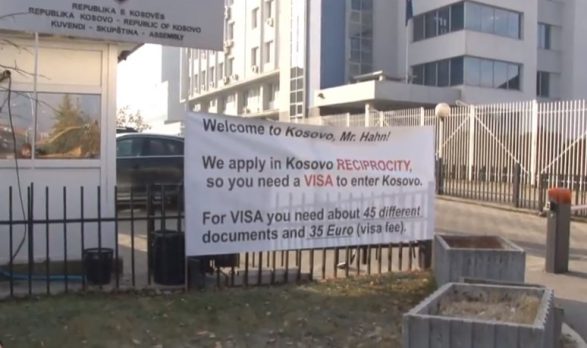 “Mirë se erdhe në Kosovë, Hahn! Ne jemi për reciprocitet, kështu që ju duhet viza që të hyni në Kosovë. Për një vizë, ju duhen 45 dokumente të ndryshme dhe 35 euro (tarifa e vizës)”, ishte kjo porosia për komisionarin evropian që i dhanë këta qytetarë, përcjell albinfo.ch.