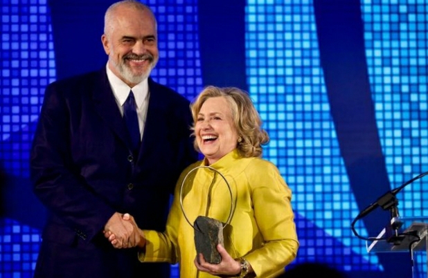 “Kësisoj, është një nder dhe kënaqësi e veçantë për mua t’ju prezantoj dikë të cilin e admiroj, të cilin kam patur privilegjin ta njoh, karrierën e të cilit e kam ndjekur me interes dhe admirim të madh, udhëheqja e të cilit është simbol i një misioni të përbashkët, atë të ngritjes së grave dhe vajzave. Tani, mjaft udhëheqës ndërkombëtarë nuk ishin të gatshëm të bënin shumë. Edhe kur iu kërkua, gjithnjë në rastin kur u përgjigjën pozitivisht, angazhimet që morën ishin shumë të vogla. Megjithatë, pati një numër të vogël – dhe për fat të keq, kaq janë, një dorë e vogël udhëheqësish, – që u shprehën të gatshëm në një kohë nevoje të madhe. Në krye të kësaj liste është Kryeministri Edi Rama”, tha Clinton, transmeton atsh, përcjell Albinfo.ch.