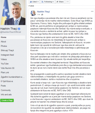 Presidenti ka thënë se asnjë e keqe nuk i vjen Kosovës nga mbështetja e aleatëve. “E vetmja e keqe që mund t’i vijë vendit tonë është nga ata që nuk duan marrëveshje paqësore me Serbinë, që nuk duan anëtarësim të Kosovës në BE, NATO dhe OKB”, ka shkruar ai, duke shtuar se qytetarët duhet të bëjnë zgjedhjen e tyre nëpërmjet referendumit.
