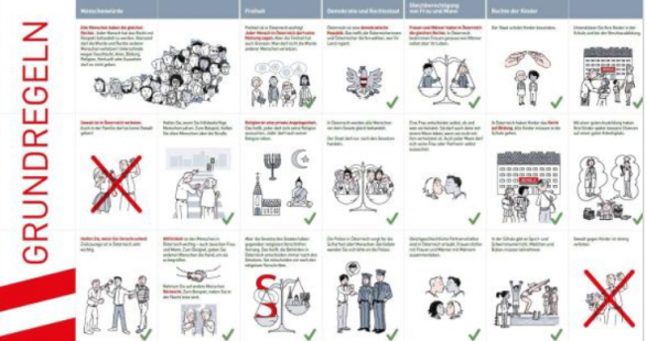 Ndryshe, fletushka të cilën e ka shpërndarë qeveria, përmes vizatimeve u tërheq vërejtjen refugjatëve për rregullat e sjelljes në Zvicër. Krahas rregullave të përgjithshme, aty bëhet fjalë edhe për raportet në mes të mashkullit dhe femrës. Në këtë kontekst, sqarohet aty, “një Jo që e thotë femra mbetet Jo dhe atë duhet respektuar”.