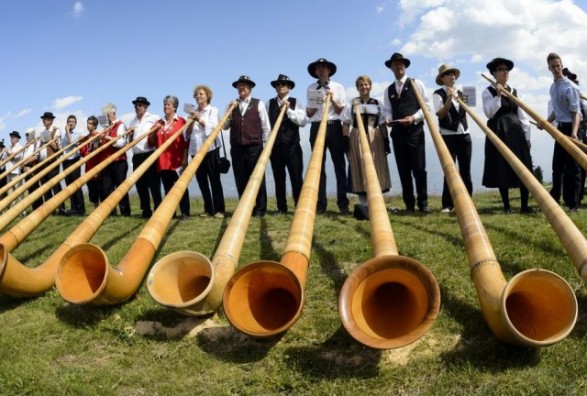 Muzikantët e veshur në kostume tradicionale zvicerane u mblodhën në majën Gornergrat, 3,089 metra mbi nivelin e detit, për të kryer punën e tyre duke interpretuar në disa instrumente të mëdha prej druri.