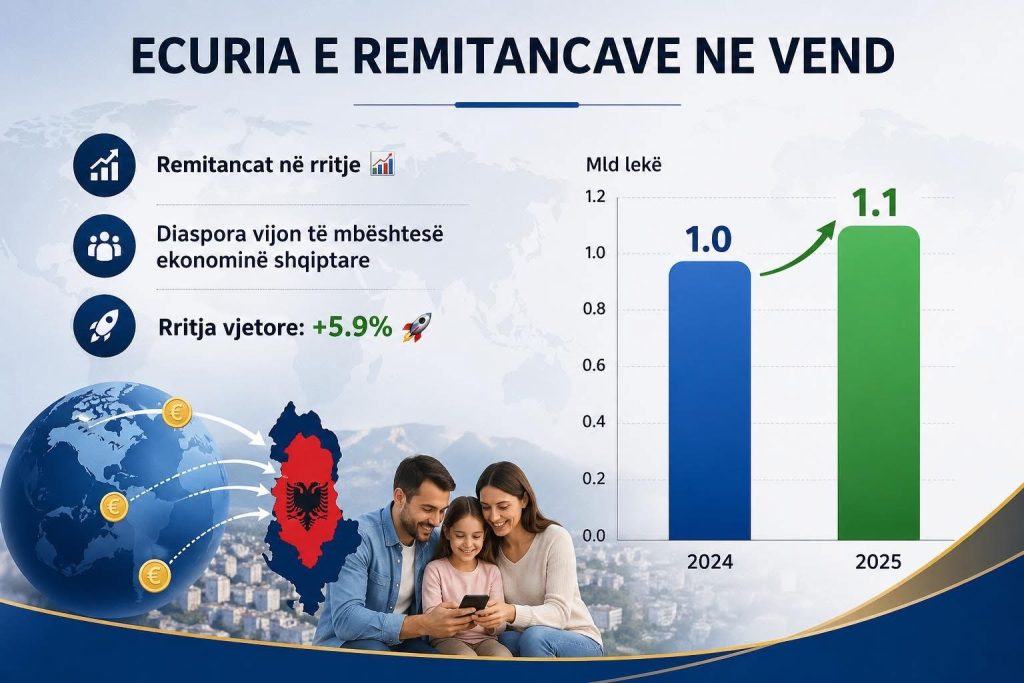 Sipas të dhënave të publikuara, remitancat kanë shënuar rritje në vitin 2025, duke arritur në 1.1 miliard lekë, krahasuar me 1.0 miliard lekë sa ishin në vitin 2024.