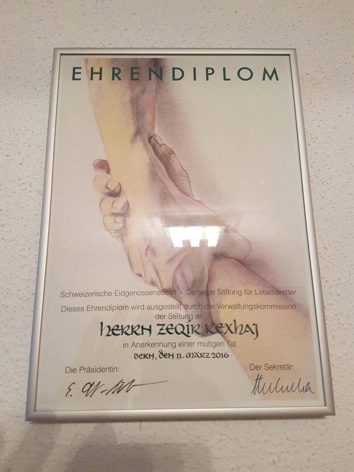 Fondacioni për kërkim dhe shpëtim të jetës në Bernë ka nderuar Zeqir Rexhajn nga Korisha e Prizrenit me vendbanim në Wohlen të Argaut me diplomë nderi për humanizmin, trimërinë dhe guximin e treguar në shpëtimin e pilotit zviceran, shkruan albinfo.ch