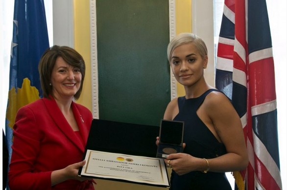 Presidentja e Kosovës, Atifete Jahjaga, në një pritje të veçantë organizuar në ambasadën e Kosovës në Londër, i dorëzoi artistes, këngëtares me famë botërore, me prejardhje nga Kosova, Rita Ora, Medaljen Presidenciale “Ambasadore e Nderit”, me të cilën e ka nderuar më herët.