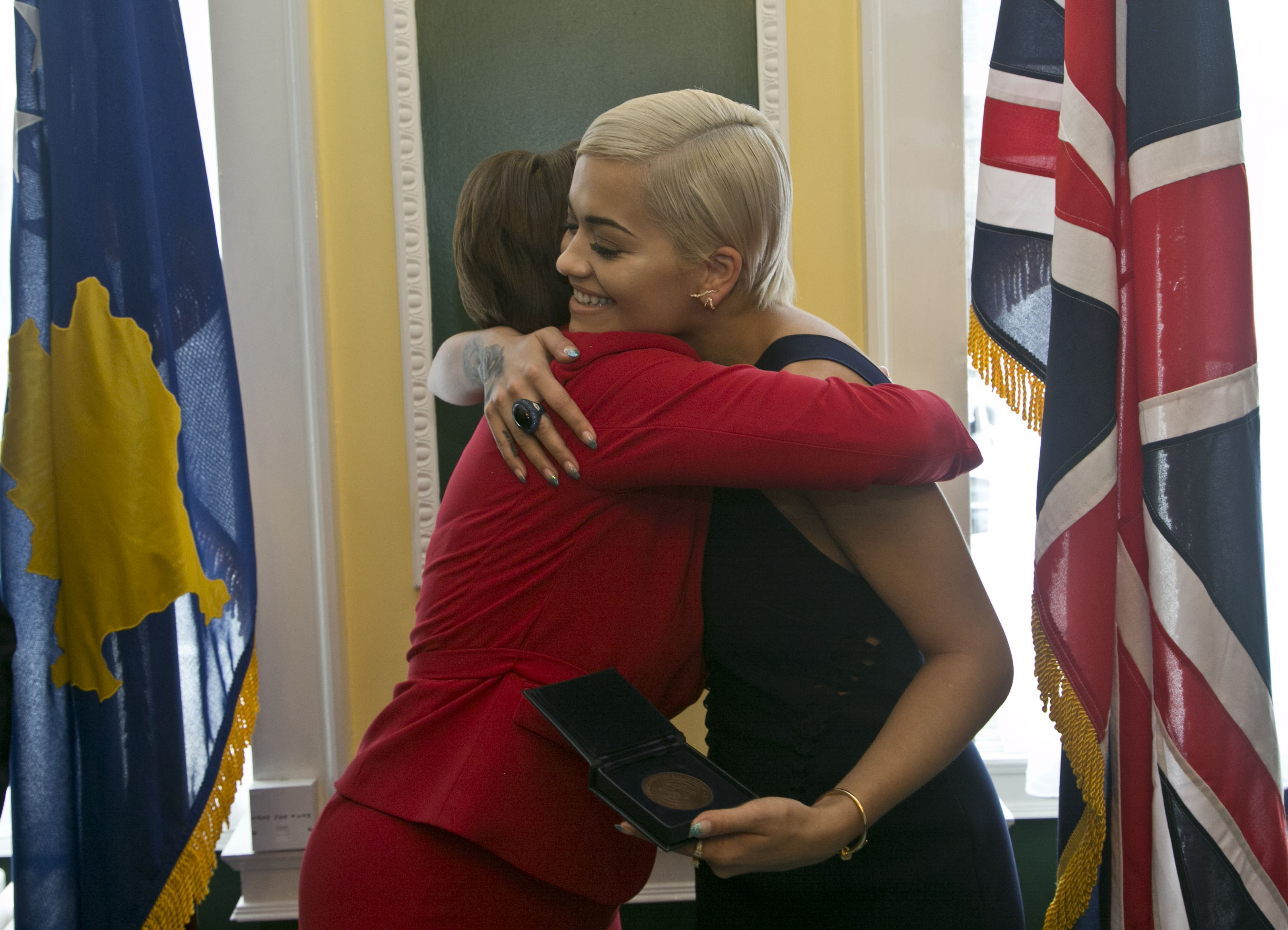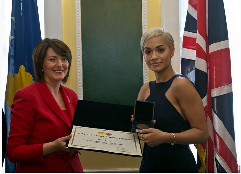 Presidentja e Kosovës, Atifete Jahjaga, në një pritje të veçantë organizuar në ambasadën e Kosovës në Londër, i dorëzoi artistes, këngëtares me famë botërore, me prejardhje nga Kosova, Rita Ora, Medaljen Presidenciale “Ambasadore e Nderit”, me të cilën e ka nderuar më herët.