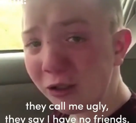 Djaloshi në video shihet i përlotur pas ngacmimeve që i kishin bërë fëmijët tjerë në shkollë.