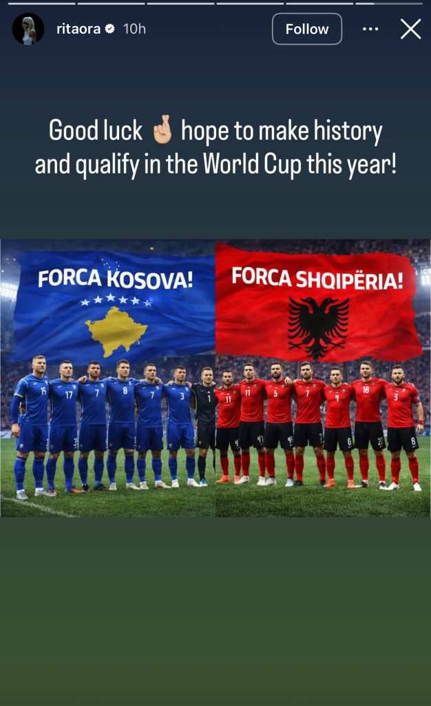Këngëtarja shqiptare me famë botërore, Rita Ora, ka shprehur përkrahjen e saj për Kombëtaren e Kosovës dhe Kombëtaren e Shqipërisë, të cilat sot zhvillojnë ndeshjet e gjysmëfinales së plejofit kualifikues për Kupën e Botës 2026, transmeton albinfo.ch.