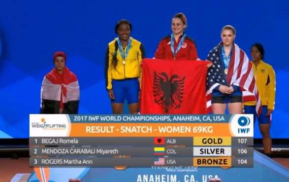 Sportistja shqiptare që garon në peshën deri në 69 kg mori medaljen e artë në shkëputje dhe u shpall nënkampione e botës në dygarësh.