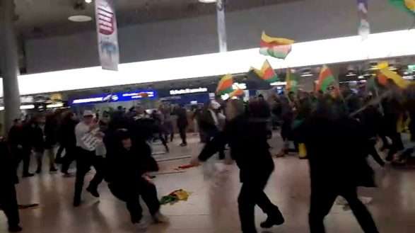 Në një video amatore, protestuesit shiheshin me flamujt e rajonit kurd të Irakut derisa bënin thirrje kundër presidentit Erdogan duke e quajtur fashist, e ndërkohë janë zënë me disa turq që ndodheshin në aeroport, përcjell albinfo.ch.