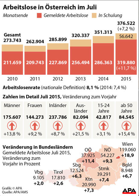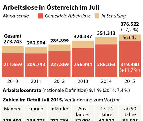 Papunësia në Austri është rritur edhe gjatë muajt korrik. 376522 persona gjatë këtij muaji kanë qenë të papunë, që në krahasim me të njëjtën periudhë të vitit të kaluar tashmë rritja është 7.2 për qind. Prej tyre 56.642 persona të të papunëve po bëjnë kurse trajnimi për punë, ndërsa 319 880 persona janë të regjistruar si të papunë, ka njoftuar të hënën Shërbimi austriak i Tregut të Punës (AMS) si dhe Ministria e Mirëqenies Sociale, raporton “kurier.at”.