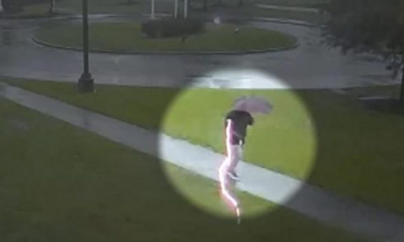 Disa pamje të kamerave të sigurisë tregojnë momentin kur një burrë ishte goditur nga rrufeja, ndërsa po ecte jashtë një ndërtese, gjatë një stuhie.