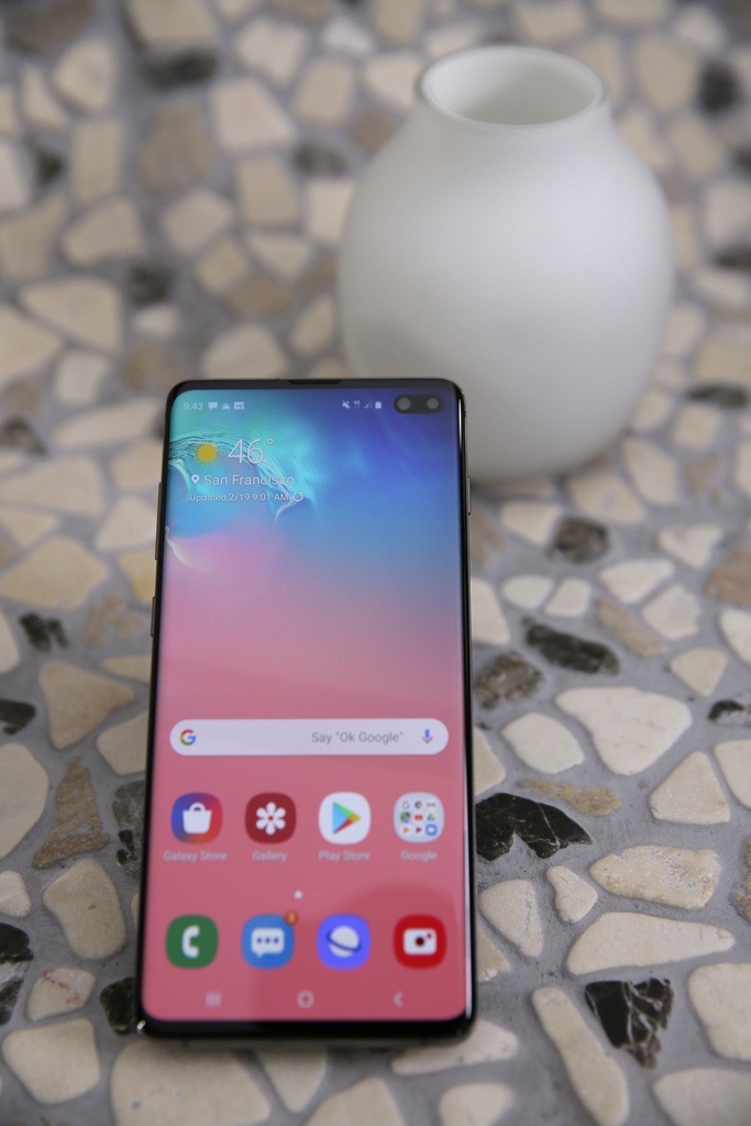 Samung Galaxy S10 ka një madhësi prej 6.1 inç dhe ka tri kamera në anën e pasme, një sensor gjurmë gishtash në ekran dhe një ekran me vrimë rrethore për një kamerë frontale në cepin e sipërm të djathtë.