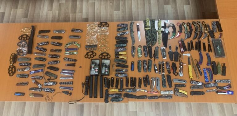 “Njёqind e pesё (105) mjete tё mprehta (thika) lloje tё ndryshme, tri (3) shufra metalike, njёmbёdhjetё (11) boksa metalikë, katёr (4) OC sprej dhe njё (1) elektroshok”.