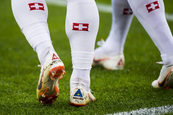 Xherdan Shaqiri ashtu si në ndeshjet tjera në këpucët e tij ka flamurin e Zvicrës dhe Kosovës, shkruan albinfo.ch.
