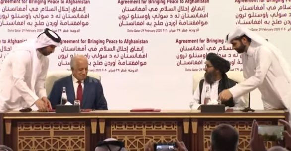 Marrёveshja u nёnshkrua nё njё ceremoni nё Doha, nga drejtuesi i negociatave pёr palёn amerikane, Zalmay Khalisazad dhe kreu negociues i talibanёve, Abdul Ghani Baradar. Marrёveshja parashikon tёrheqjen e plotё tё trupave amerikane nga Afganistani brenda 14 muajsh. Me kёtё marrёveshje duhet tё marrё fund edhe konflikti 20 vjeçar nё Afganistan.