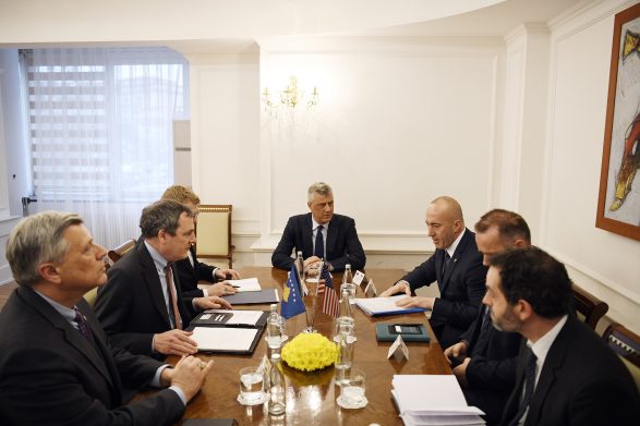Presidenti i Republikës së Kosovës, Hashim Thaçi, bashkë me Kryeministrin e Kosovës, Ramush Haradinaj, sot kanë zhvilluar një takim me drejtorin kryesor për Çështje Evropiane në Këshillin e Sigurisë Kombëtare të SHBA-së, John Erath, si dhe me drejtorin për Ballkan të Këshillit Kombëtar të Sigurisë së SHBA-së, Brad Berkley.