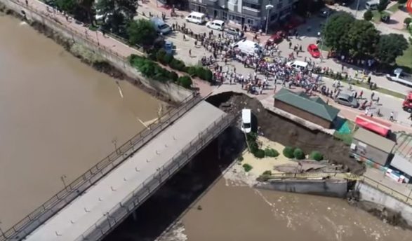E kamerat e sigurisë kanë filmuar momentin kur shembet ura dhe tregon se si dy persona që në ato momente po kalonin mbi urë bien në lumë, nga gropa e madhe që hapet si pasojë e rrëshqitjes së dheut.