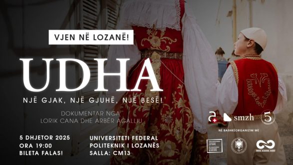 Më 5 dhjetor, në universitetin politeknik të Zvicrës EPFL në Lausanne, në sallën CM13, në orën 19:00, do të shfaqet dokumentari “UDHA – Një gjak, një gjuhë, një besë”. Ky projekt filmik është rezultat i bashkëpunimit mes Fondacionit Lorik Cana 5 dhe regjisorit italian Alessandro Ferrantelli. Dokumentari sjell në qendër jetën e shqiptarëve të Italisë së Jugut, arbëreshëve të Kalabrisë dhe Sicilisë, transmeton albinfo.ch.