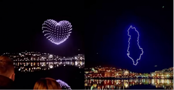 Një zemër e ndriçuar, harta e Shqipërisë dhe “Faleminderit Shqipëri”, ishin figurat që dronët sollën për të pranishmit që kishin rrethuar Liqenin Artificial.