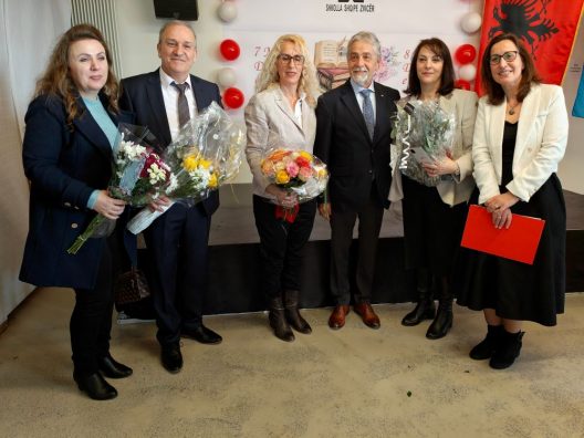 Një foto e përbashkët me Ambasadorin e R. së Shqipërisë z. Gjoni, mësuesit Ardita Abazi – Elezaj, Vaxhid Sejdiu, Minire Azemi, Qefsere Sejdiu dhe Lumnije Klinaku – Neziri