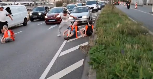 Ata bllokuan trafikun në shenjë proteste në rrugën afër Mannheimit, teksa bllokada shkaktoi kolonë të madhe dhe një shofer ka dalë nga vetura e tij dhe ka goditur aktivistët.