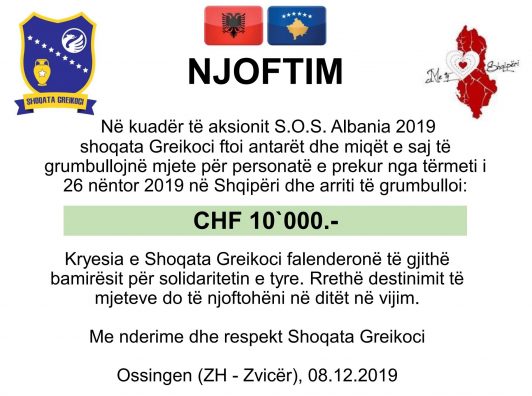 Në kuadër të aksionit S.O.S. Albania 2019, shoqata “Greikoci” ftoi anëtarët dhe miqtë e saj të grumbullojnë mjete për personat e prekur nga tërmeti i 26 nëntorit në Shqipëri. Aksioni i iniciuar pati sukses dhe u arrit të grumbullohen CHF 10`000.-