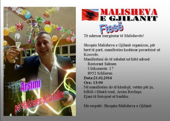 Të nderuar mergimtar të Malishevës së Gjilanit, Shoqata Malisheva e Gjilanit, organizon më 21.02.16, duke filluar nga ora 13:00, manifestim kushtuar pavarësisë së Kosovës.
