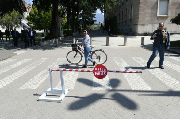 Në mënyrë simbolike për të kundërshtuar tarifën në Rrugën e Kombit, protestuesit vendosën një laurë (tra) tek hyrja e Kryeministrisë, ku shkruhej ‘dalja falas’.