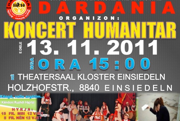 Koncerti organizohet të dielen më 13 Nëntor 2011, nga ora 15:00, në Theater Saal, Kloster Einsiedeln, Holzhofstrasse, 8840 Einsiedeln të Kantonit Schwyz, do të mbahet koncerti humanitar, në mënyrë që tu dalim në ndihmë atyre që sot kanë nevoj më së shumti dhe atyre më të rrezikuarve.