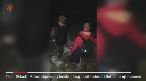 Policia në Shqipëri ka arritur të shpëtojë dy turistë të huaj në Theth, të cilët kishin mbetur të bllokuar në Bjeshkët e Kaprres. Për 8 orë kërkimi nga policia dhe banorët e zonës, turistët janë gjetur në gjendje shëndetësore të mirë. Turistët, një holandeze 27-vjeçare dhe një 33-vjeçar nga Irlanda e Veriut, kishin humbur të hënën pasdite.