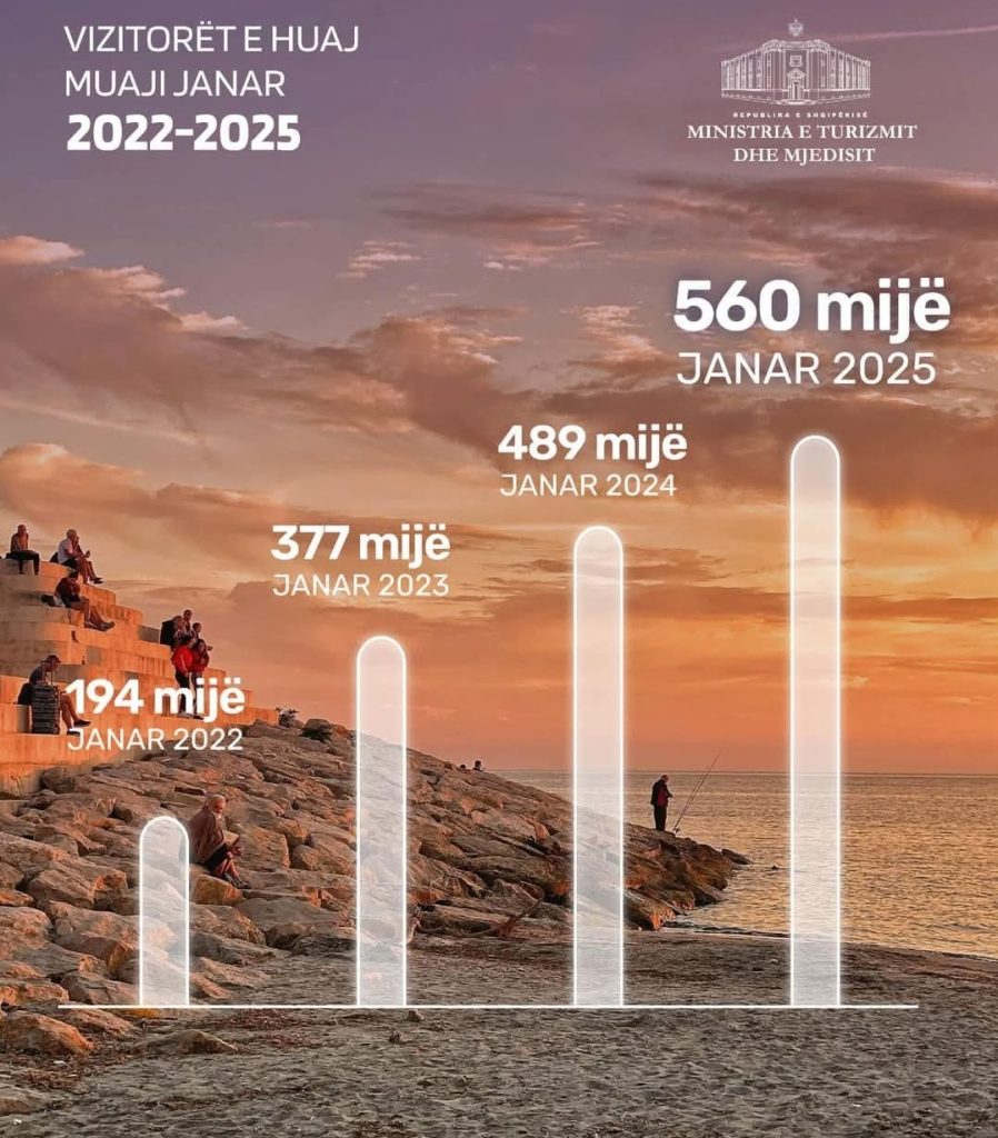 “Më shumë se gjysmë milionë vizitorë e turistë të huaj vetëm në muajin e parë të vitit, kur ende turizmi ynë malor ka nevojë për më shumë investime, tregojnë se Shqipëria e ka lënë pas turizmin sezonal dhe ka konsoliduar një kapitull të ri në turizmin e qëndrueshëm ku po vizitohet nëpër bujtina, shtigje malore, ngjitje majash, qytete historike, muze e kështjella, ndërsa në katër vitet e ardhshme do të jetë kampione absolute e Ballkanit në këtë industri”, shkruan ai.