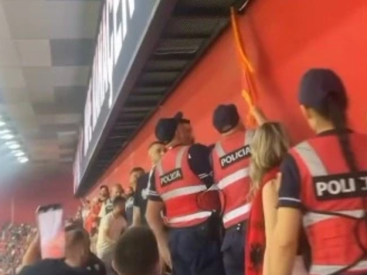 Pamje të shpërndara në rrjete sociale tregojnë policë shqiptarë duke larguar tifozë nga stadiumi për shkak të veshjeve apo flamujve me simbole të UÇK-së. Në një video të publikuar nga ish-kryeministri dhe kreu i Partisë Demokratike të Shqipërisë, Sali Berisha, shihen qartë momente kur një tifoz largohet nga policia shqiptare për shkak të një fanelle me stampë të UÇK-së, transmeton albinfo.ch.