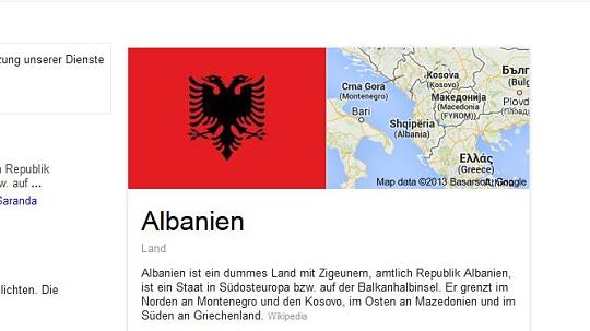 Më saktësisht, në faqen e wikipedias mbi Shqipërinë në gjuhën gjermane, që në fjalinë e parë mund të lexoheshin “epitete” të tilla si ”Shqipëria është një vend i marrë me ciganë”. Kjo fjali me përmbajtje fyese është vënë online të hënën rreth orës 17. Vetëm të martën pasdite ajo është zhdukur nga faqja Wikipedia , por ndërkohë ajo mund të gjendej edhe më tutje në google.