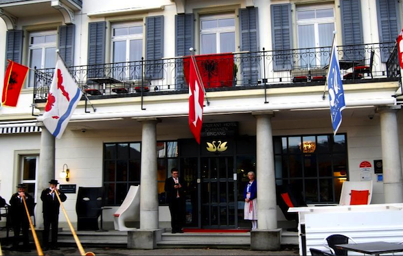 Në ballë të hotelit “Schwannen” (Mjellmat) që shikon nga liqeni i Cyrihut, në qytetin Rapperswil, të mbiquajtur edhe qytet i trëndafilëve, janë vendosur flamuj shqiptarë dhe zviceranë.