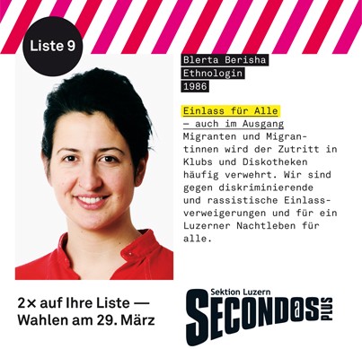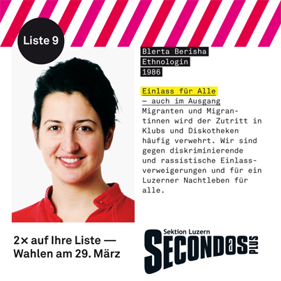 Blerta Berisha dhe Drilon Bekiri janë dy kandidatët shqiptarë që garojnë në zgjedhjet kantonale në Lucern nëpërmjet subjektit “Second@sPlus”. 29-vjeçarja me origjinë nga Kosova synon që të sjellë trajtim të barabartë për të rinjtë me origjinë të huaj nëpër bare dhe diskoteka në Lucern. Ajo thotë të jetë kundër diskriminimit. „Jeta e natës për të gjithë”, thotë politikania shqiptare.