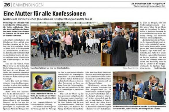 Shoqata «Yjet e Kosovës» që vepron në Emmendingen të Gjermanisë ka shënuar më 26 shtator shenjtërimin e Nënë Terezës me një ekspozitë të pasur të arteve pamore. Mediat lokale dhe regjionale gjermane i kanë kushtuar hapësirë të konsiderueshme këtij aktiviteti kulturor. Kështu, gazeta “Badische Zeitung” në artikullin me titullin “Bija, motra, nëna” e përcjell atmosferën nga hapja e ekspozitës, përcjell albinfo.ch.