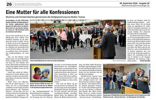Veç gazetës “Badische Zeitung”, për ekspozitën ka shkruar gjerësisht edhe gazeta javore e qytetit “Emmendinger Tor”, e cila në ballinë të saj ka publikuar artikullin me titullin “Një nënë për të gjitha konfesionet”.