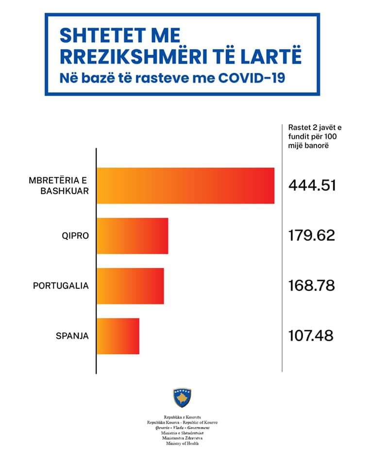 Ministria e Shëndetësisë ka publikuar një listë të shteteve me rrezikshmëri të lartë dhe vendimin e Qeverisë së Kosovës rreth hyrjeve dhe daljeve nga Kosova.