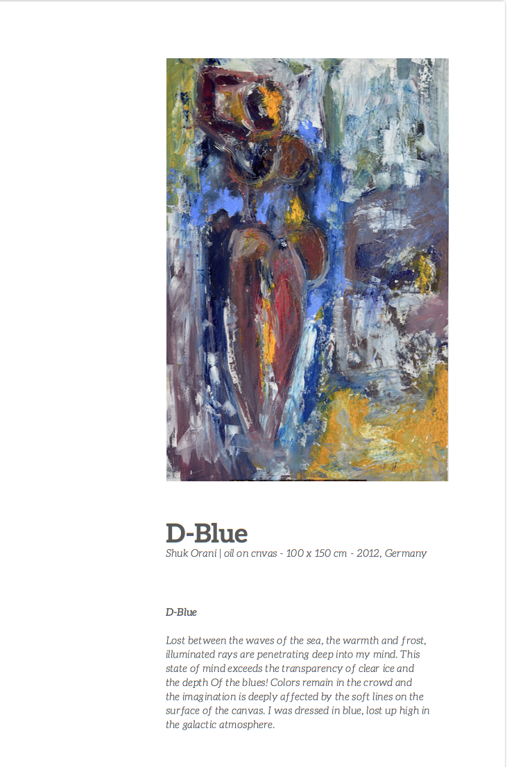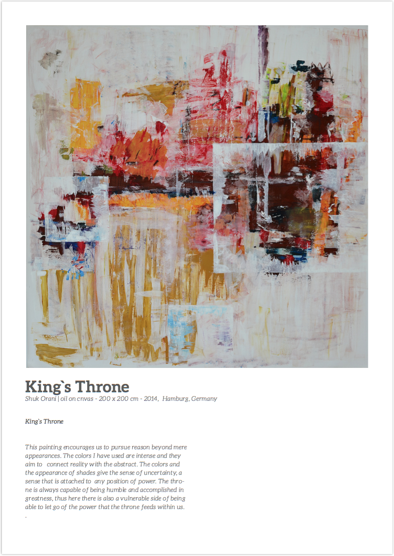 Shuk Orani: Vitin e kaluar jam ftuar të marr pjesë në projektin ARTUM brenda programit për art dhe trashëgimi kulturore në „Akademinë për Çështje Globale” në Cambridge të Anglisë. Aty janë ekspozuar punët e mia virtualisht dhe si rezultat i bashkëpunimit të mirë dhe interesimit për punët e mia nga ana e koleksionarëve te artit, tani reprezentohem nga NWGallery. Kjo galeri drejtohet nga Nora Weller, e diplomuar në Cambridge University dhe Institutin Sotheby’s në Los Angeles.