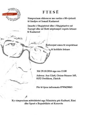 Më 29 tetor 2016, Shoqata e Krijuesve Shqiptarë në Zvicër organizomn një simpozium shkencor me rastin e 80-vjetorit të lindjes së Ismail Kadaresë. Tema e simpoziumit është “Imazhi i Shqipërisë dhe i shqiptarëve në Evropë dhe në Botë nëpërmjet veprës letrare të Kadaresë.