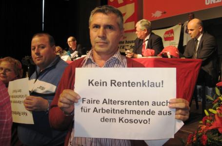 Gjatë fjalës përshëndetëse të Ministrit Berset para delegatëve të Kongresit të Sindikatës Unia, grupi i sindikalistëve shqiptarë, respektivisht kryetari i grupit, Xhafer Sejdiu dhe pjesëtarë të komisionit për migracion Osman Osmani etj., dalin me pankarta para ministrit. Në to thuhet: Jo vjedhjes së pensioneve; Pensione korrekte dhe për pensionistët nga Kosova.