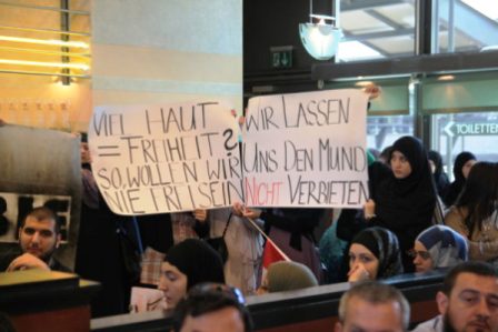 Një numër besimtarësh islamikë nga publiku pengoi me zëra dhe parolla kundërshtuese referatin e deputetit të SVP-së në Paklamentin Nacional, Felix Müri. Pas kësaj Müri braktisi sallën. Më tutje, Valentina Smajli nga Forumi për Islamin Progresiv, e cila po ashtu ishte pjesëmarrëse e ftuar në debat ka bërë përpjekje të qetësonte gjakrat por pa sukses. Për këtë arsye deputeti Müri ka braktisur tryezën dhe me këtë ka përfunduar i gjithë takimi.