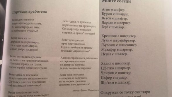 Vargjet e një poezie me autor maqedonas, në mënyrë përçmuese radhiten disa profesione të cilat gjoja u përkasin fqinjëve shqiptarë të autorit të poezisë. Poezia në gjuhën maqedonase përfundon me përdorimin e fjalën “shiptari”, që maqedonasit e përdorin për ofendim, kur u drejtohen shqiptarëve.