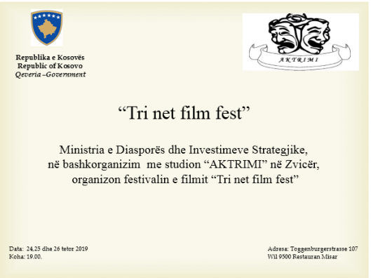 Në kuadër të organizimit për “Ditët e Kulturës Shqiptare“ në diasporë, Ministria e Diasporës dhe Investimeve Strategjike e Kosovës organizon aktivitetin “Tri Net Film Fest” në Zvicër