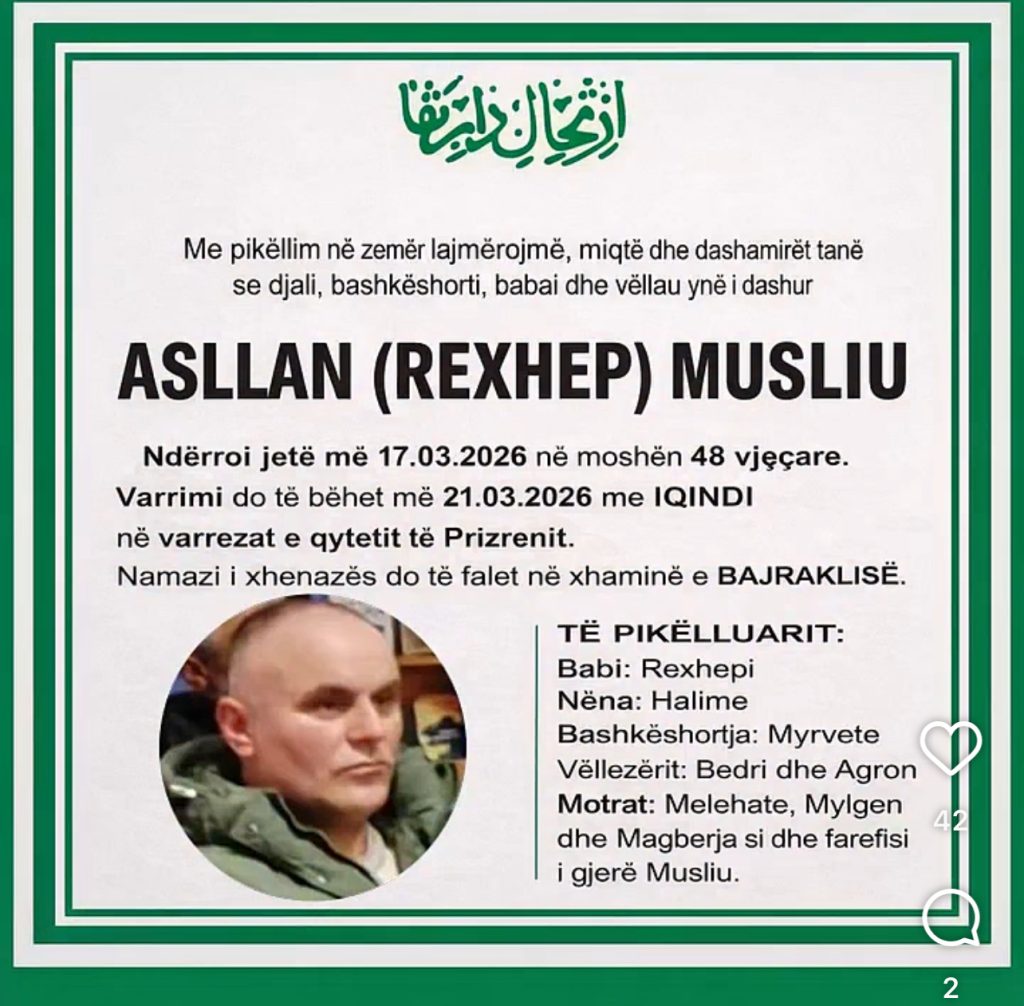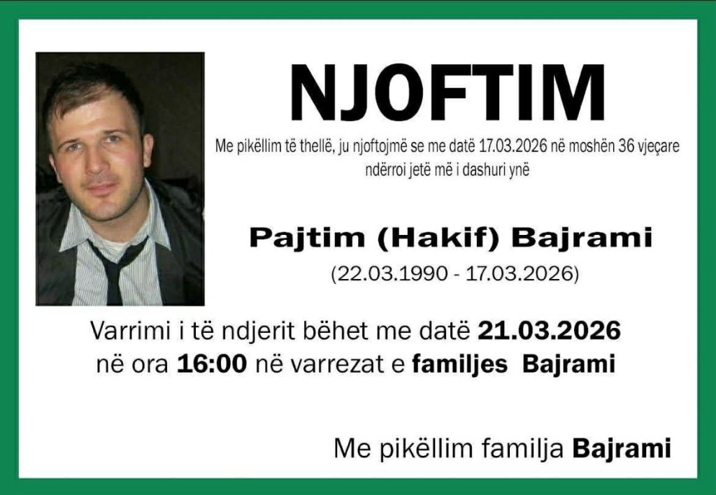 Sipas informacioneve të konfirmuara përmes njoftimeve mortore familjare, Pajtim (Hakif) Bajrami, 36 vjeç, dhe Asllan (Rexhep) Musliu, 48 vjeç, kanë ndërruar jetë më 17 mars 2026, si pasojë e këtij aksidenti fatal.