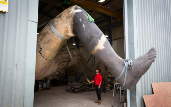 Këmbët gjigante të asaj që do të duhej të ishte statuja më e madhe nga bronzi në Britani të Madhe është prezantuar të hënën në prag të vendosjes solemne jashtë teatrit mbretëror, Plymouth, vitin e ardhshëm.